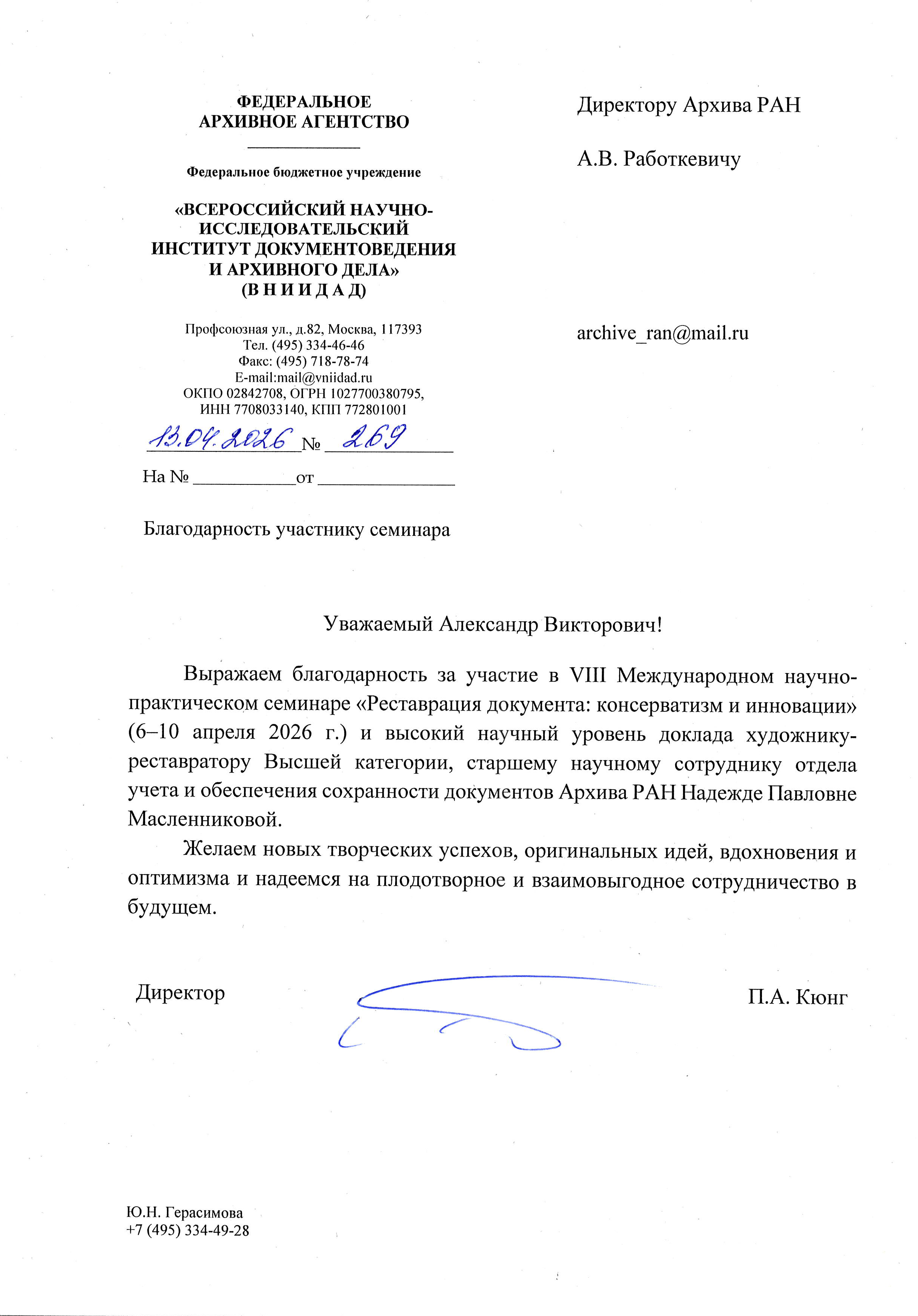 31.01.2024. Фофанов Максим Юрьевич выражает искреннюю благодарность научному сотруднику архива Рыбченковой Анне Эдуардовне за большое внимание и профессионализм с которым она относится к запросам исследователей.