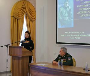 С пленарным докладом «К биографии Валентина Петровича Глушко: итоги научного описания личного фонда в Архиве РАН» выступила заместитель директора Архива РАН О.В. Селиванова. Завершение научного описания личного фонда одного из основоположников отечественного жидкостного ракетного двигателестроения открывает новые перспективы для изучения истории космонавтики. Особую ценность представляют документы ученых, которые в сложнейшее для страны время, в короткие сроки после войны сумели сделать СССР первой космической державой. Через биографические материалы мы видим их непростой жизненный путь - пример истинного служения науке и Родине.