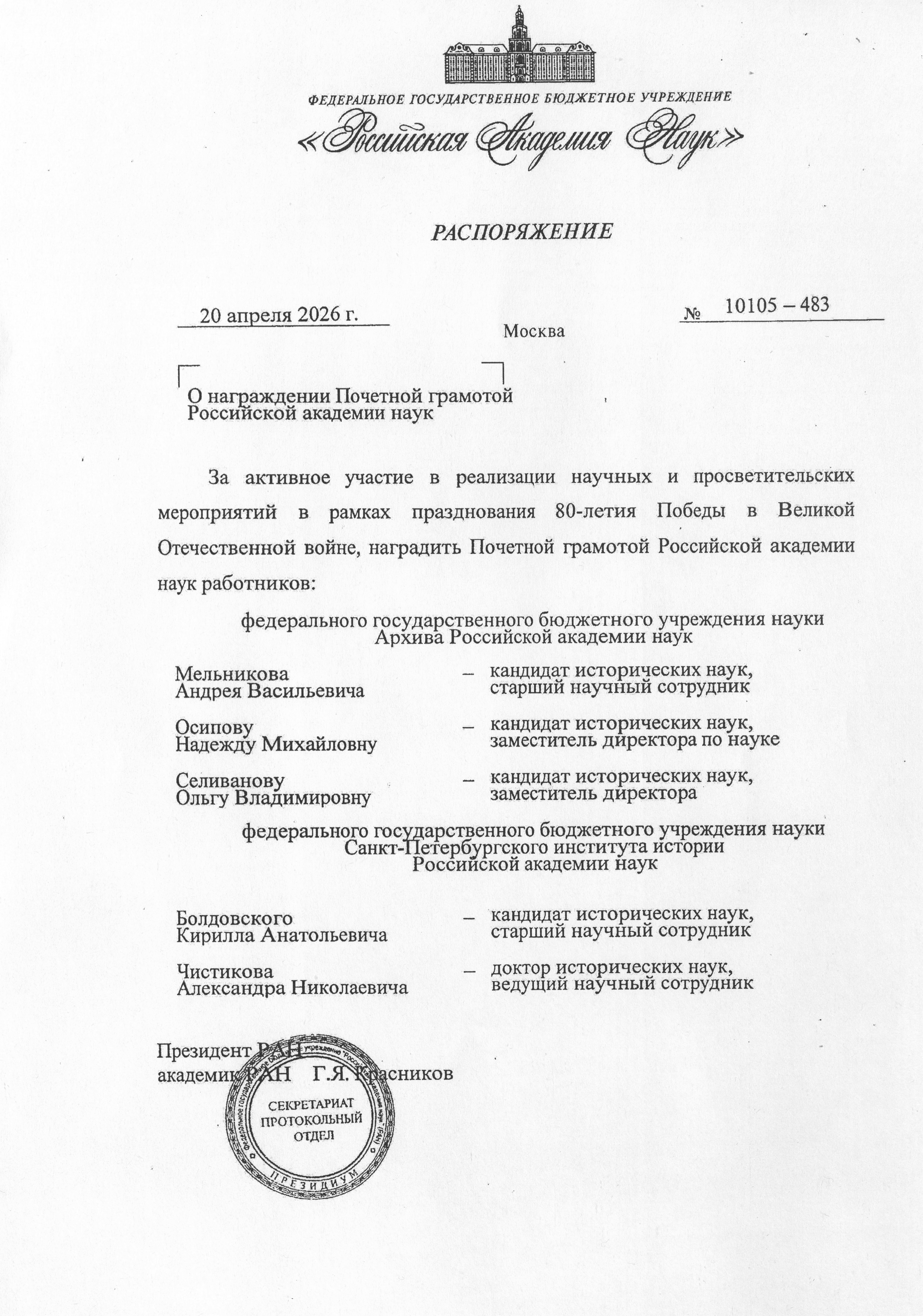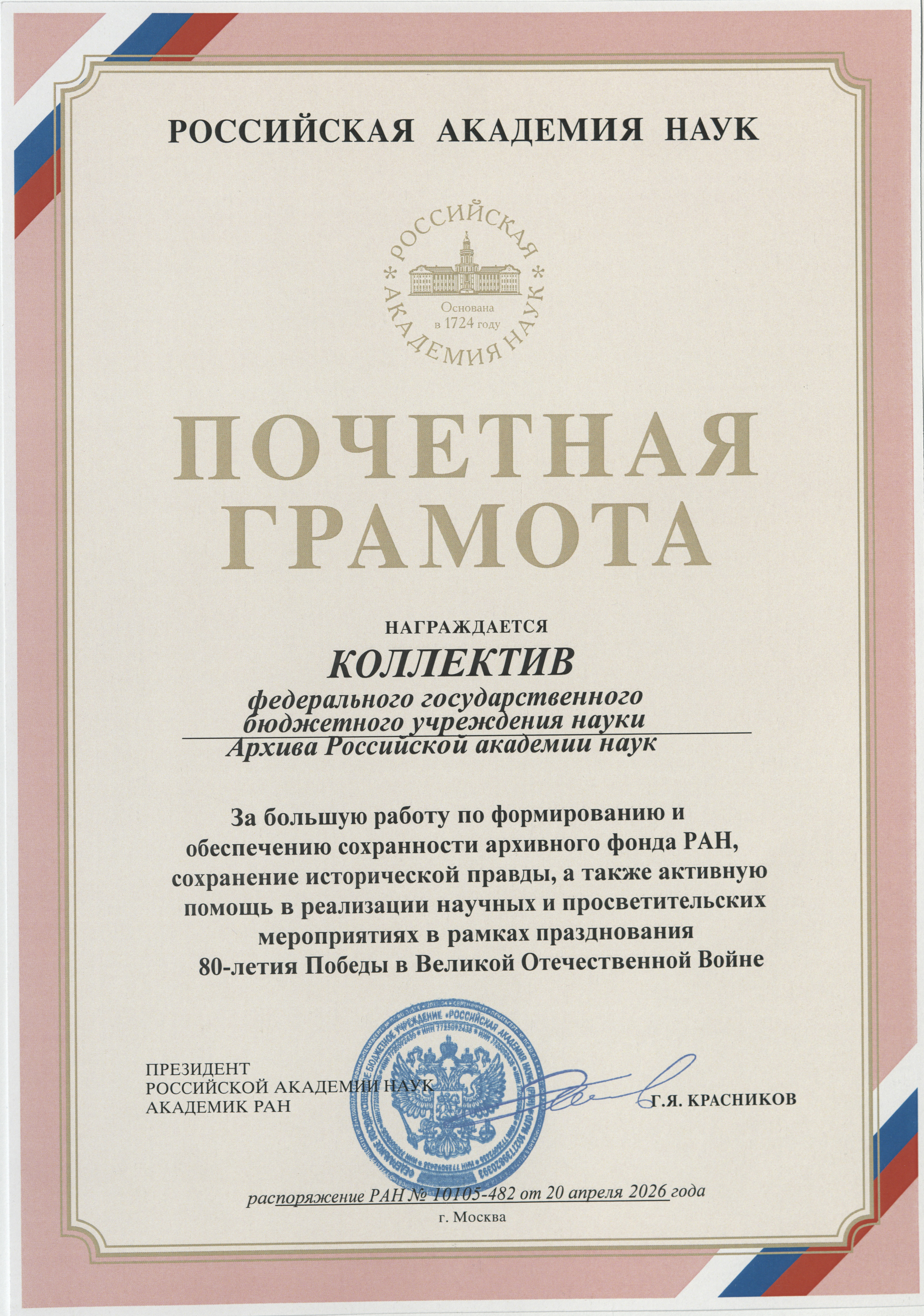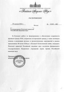 20 апреля 2026 года Распоряжением Президиума Российской академии наук Коллектив Архива Российской академии наук награжден Почетной грамотой за большую работу по формированию и обеспечению сохранности Архивного фонда РАН, сохранение исторической правды, а также активную помощь в организации научных и просветительских мероприятий в рамках празднования 80-летия Победы в Великой Отечественной войне.