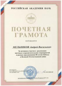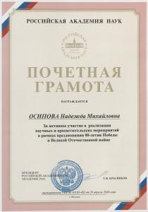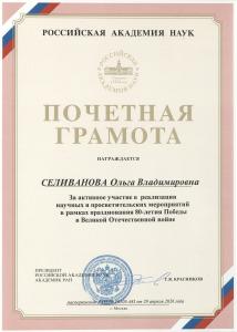 Индивидуальные грамоты за выдающийся вклад в подготовку празднования вручены заместителю директора по научной работе Надежде Михайловне Осиповой, заместителю директора Ольге Владимировне Селивановой, старшему научному сотруднику Андрею Васильевичу Мельникову.