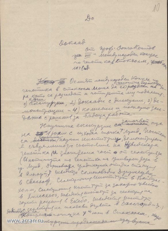 Доклад Дончо Костова, прочитанный на Восьмом международном конгрессе по генетике в Стокгольме. 1 августа 1948 г. (НА БАН. 198к. Оп.1. А.е.335. Л.10.) |