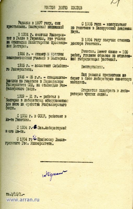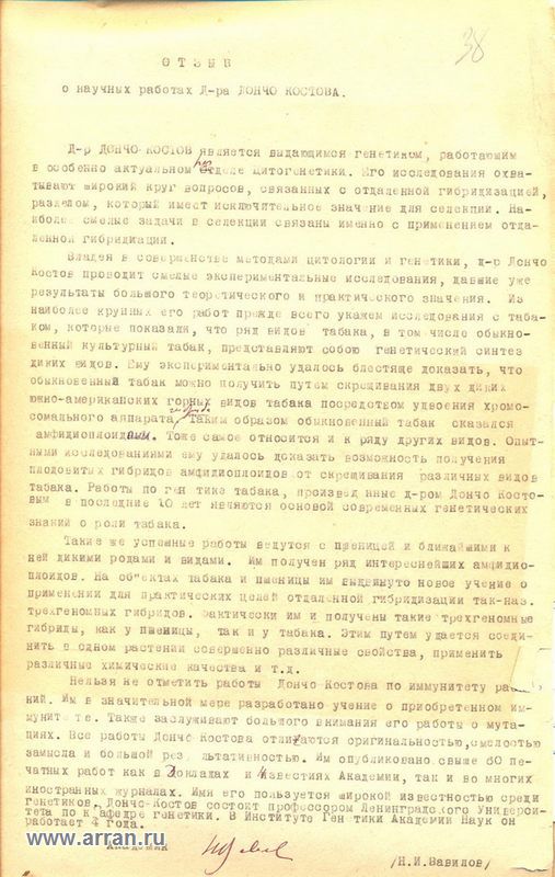 Отзыв академика Вавилова Н.И. о научных работах доктора Дончо Костова. (АРАН. Ф.201. Оп.2А. Д.52. Л.38.) |