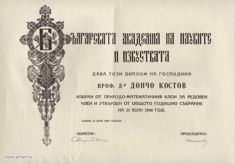 Диплом Дончо Костова об избрании его действительным членом Болгарской Академии Наук. 21 июля 1946 г. София. (НА БАН. 198к. Оп.1. А.е. 40. Л. 1.) |