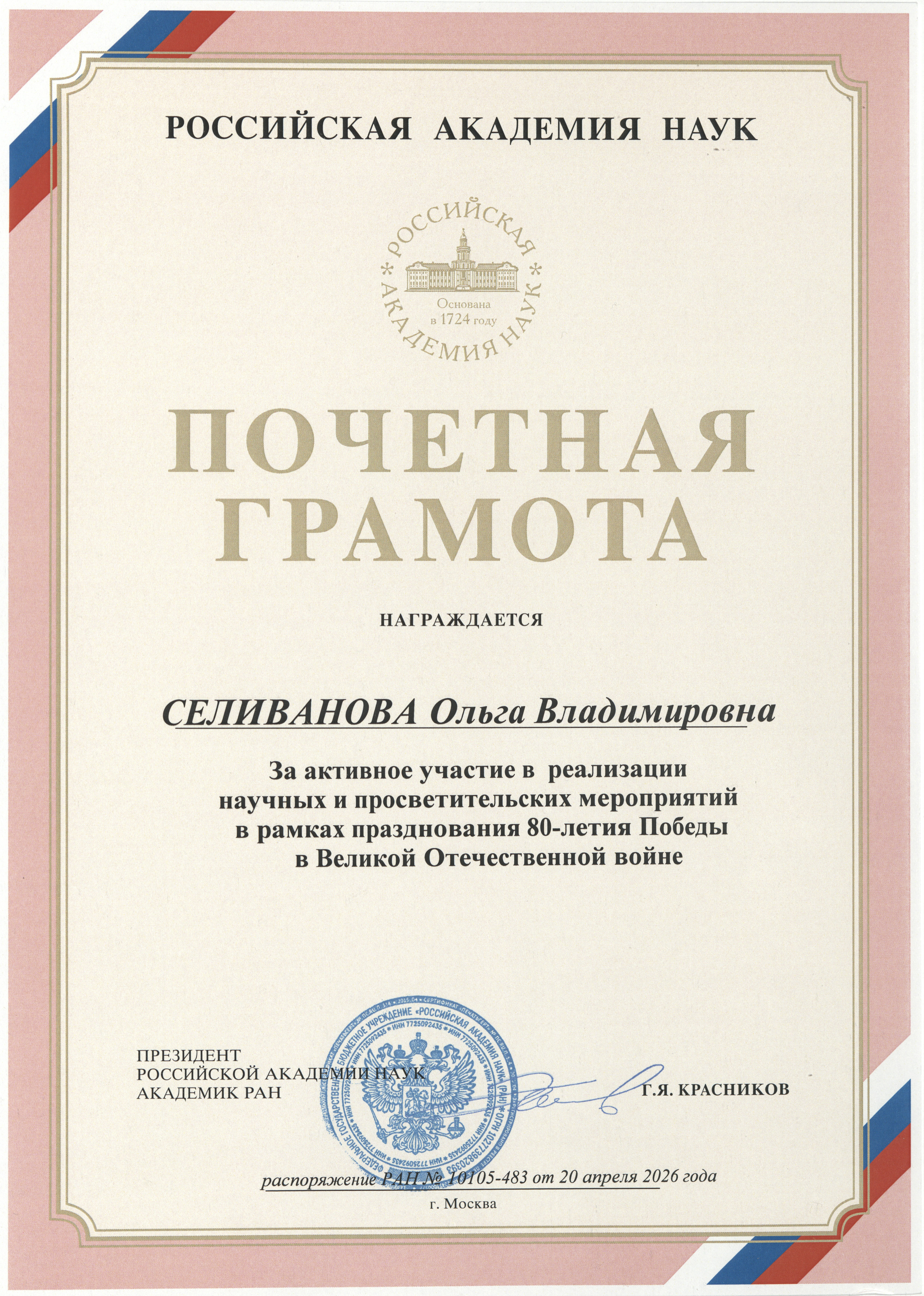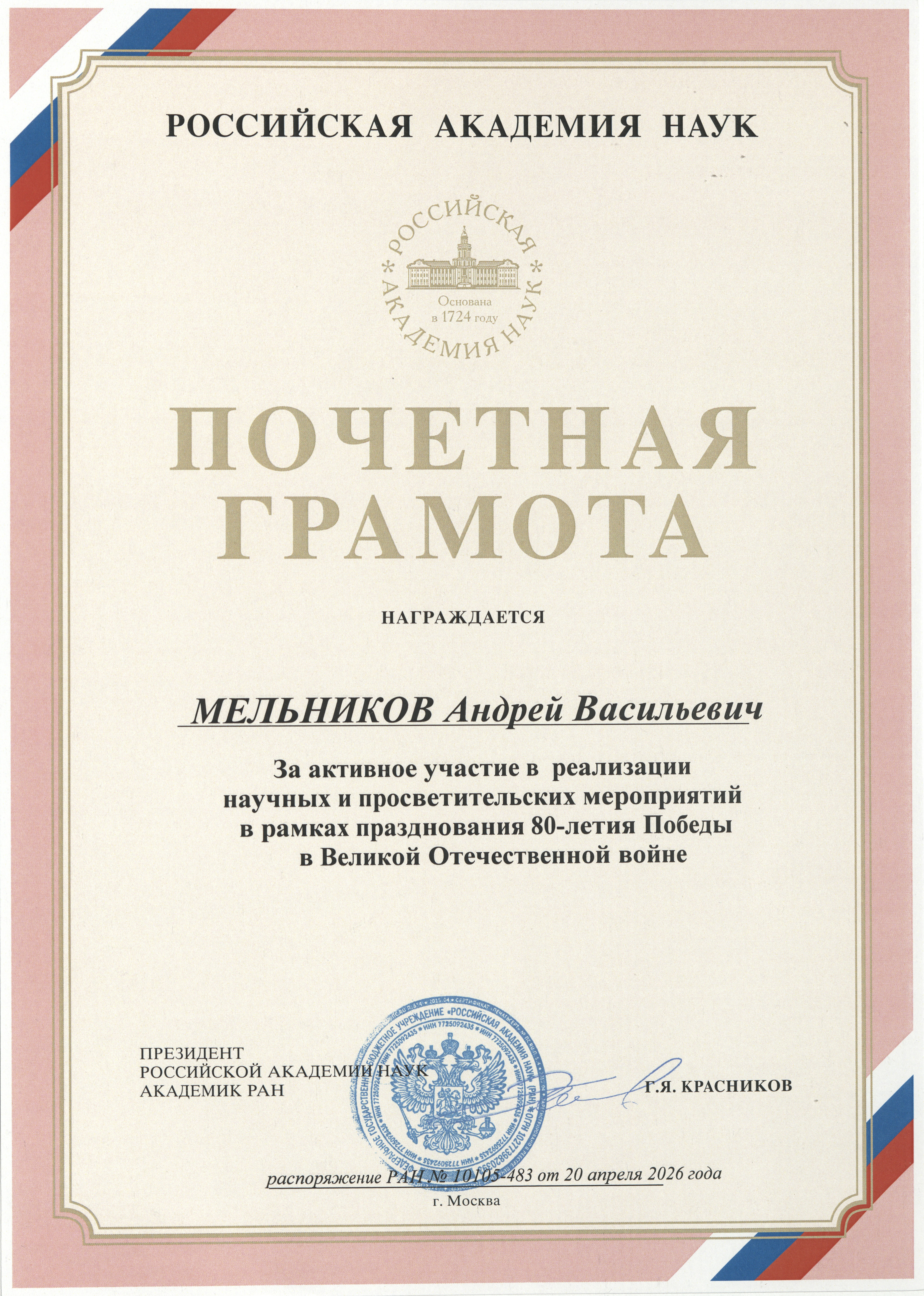 20 апреля 2026 года Распоряжением Президиума Российской академии наук Коллектив Архива Российской академии наук награжден Почетной грамотой за большую работу по формированию и обеспечению сохранности Архивного фонда РАН, сохранение исторической правды, а также активную помощь в организации научных и просветительских мероприятий в рамках празднования 80-летия Победы в Великой Отечественной войне.